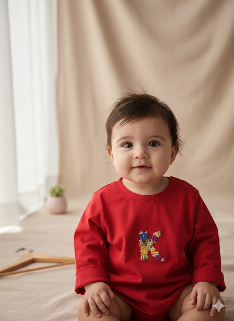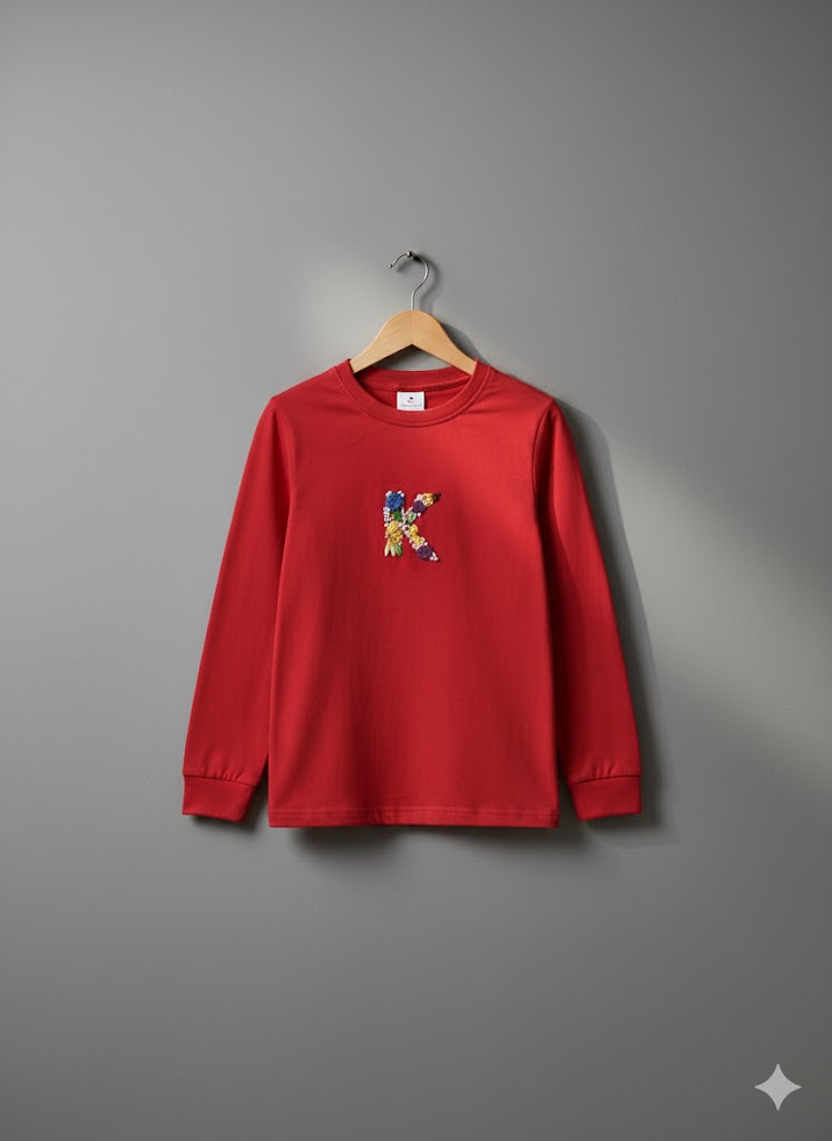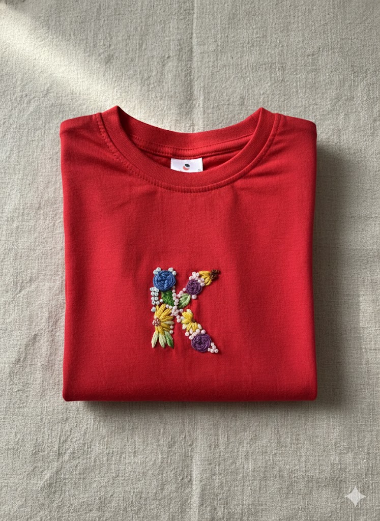 A beautifully handcrafted tee featuring a delicate floral ‘K’ embroidery. Thoughtfully designed to add a personal touch, each piece is made with love and can be customized with your chosen initial.