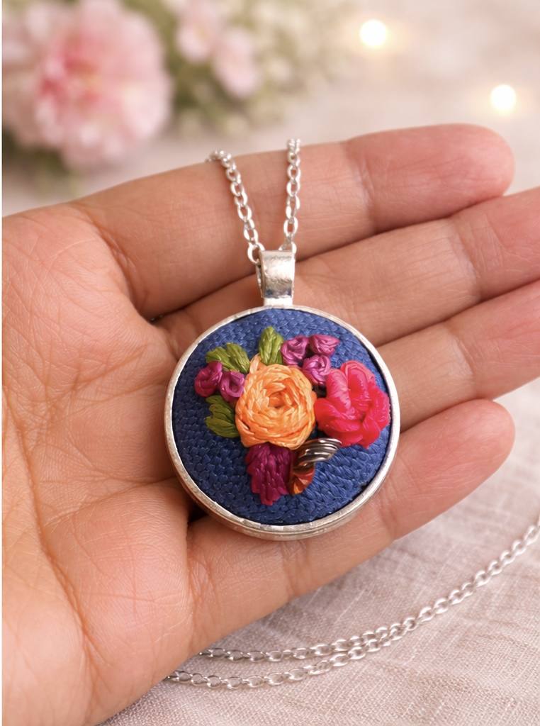 A delicate piece of wearable art, this hand-embroidered floral pendant is crafted with vibrant threads and intricate stitches on fabric. The miniature floral design is carefully stitched and set inside a round metal pendant, creating a beautiful blend of traditional embroidery and modern jewelry.