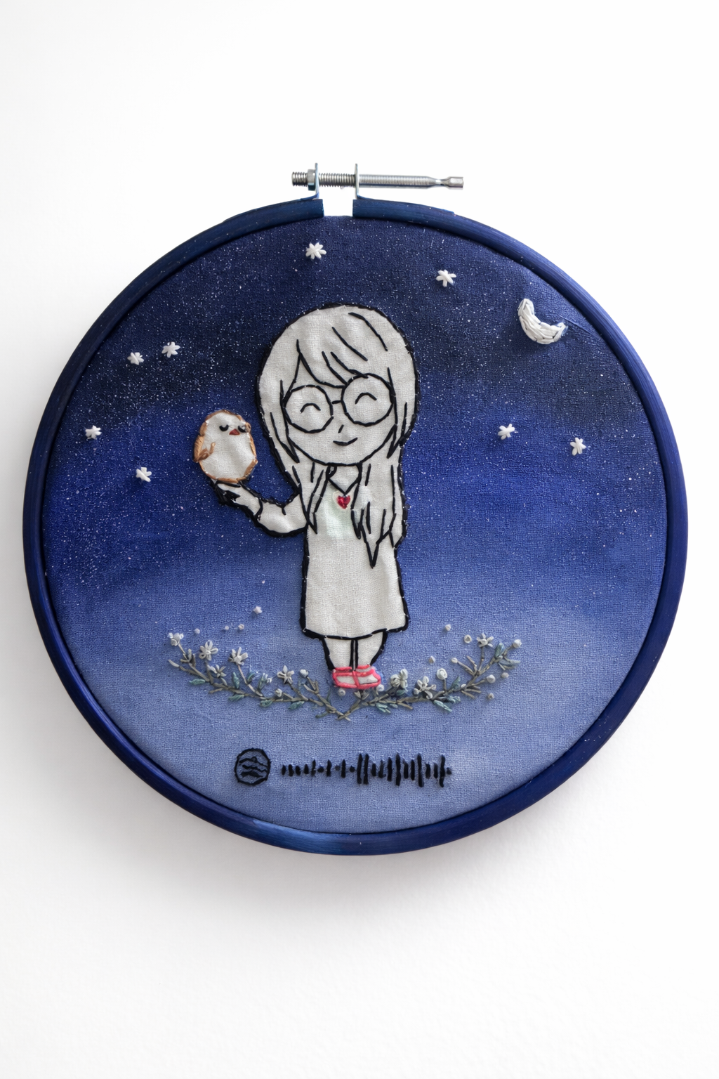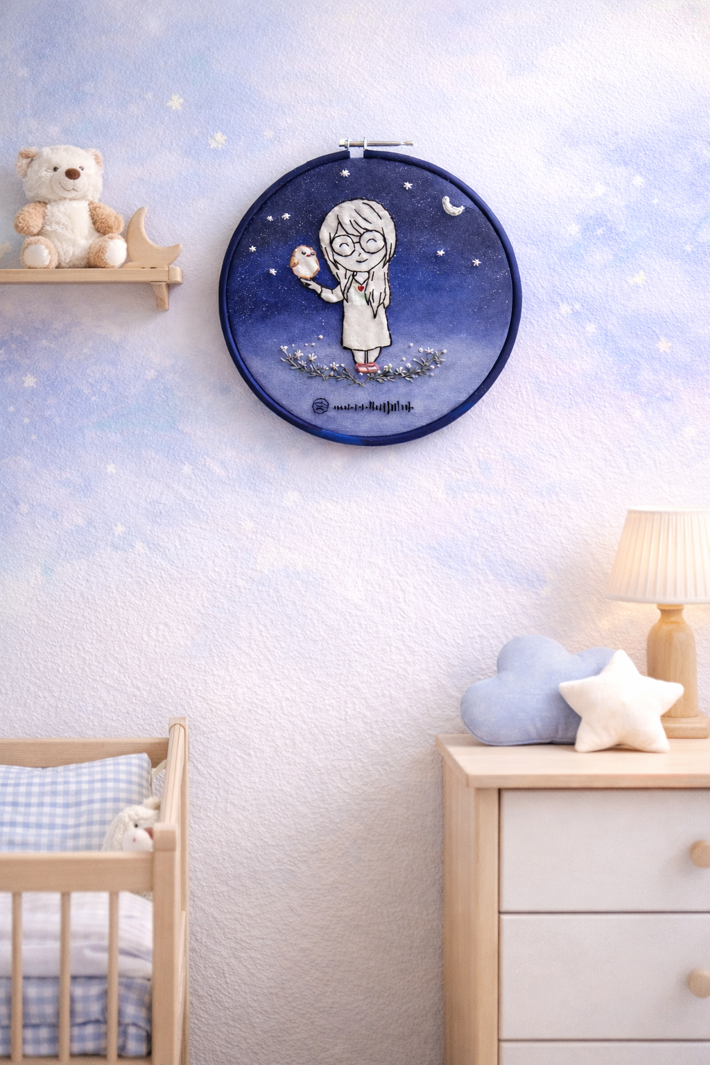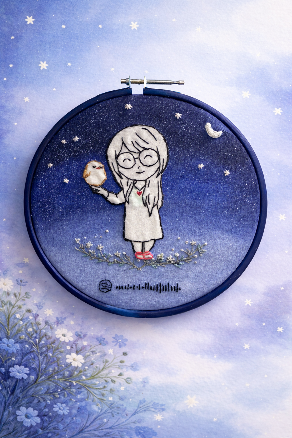 This handcrafted embroidery hoop captures a quiet, magical moment — a little girl standing beneath a starlit night, holding her tiny companion close. Surrounded by soft florals and celestial elements, every stitch reflects warmth, innocence, and calm.